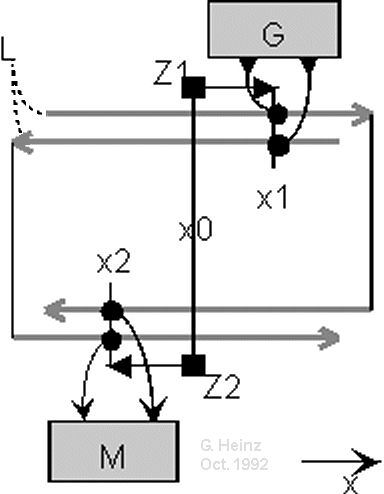 Fig.3: One-dimensional interference projection. An excitement at the side G generates an mirrored interference position at the other side M (circuit created in october 1992). Note the main differences to electric circuits: wires L have different tasks. Wires in interference schemes are supposed to be without attenuation, but they have a transmission speed. They are not nodes, constructed to carry currents or to drive loads. Comparable to nerves they symbolize the directed flow of time-functions from and to different points with definitive speeds or delays.