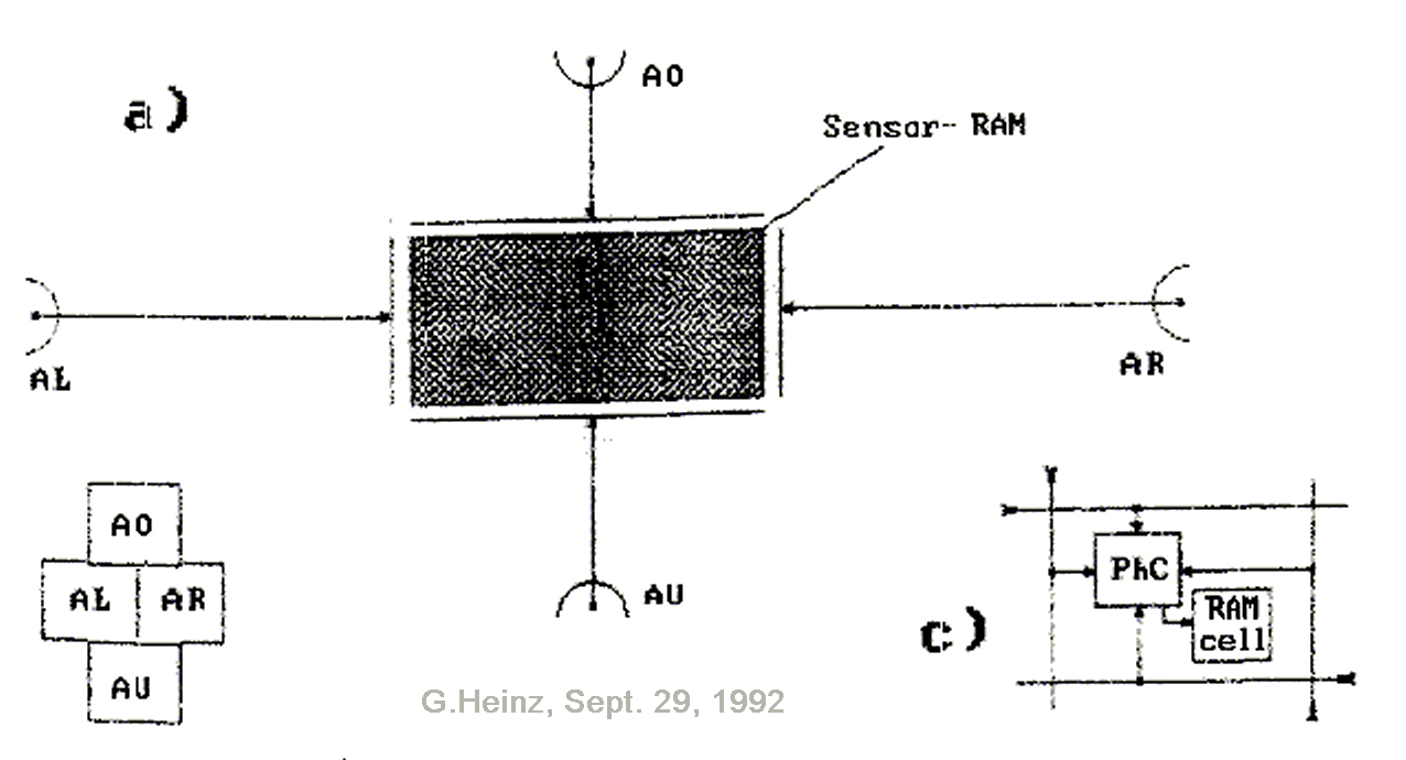 Fig.1: a) Sketch of the Receiver for (pulse-) Radar-images from Sept. 29, 1992. c) Single detector cell. (PhC: Phase comparator as 4-input AND, Ax: Antenna above O, down U, left L, right R). Each phase comparator should drive an indicator LED. Since a mirrored projection is received, the antenna cables for up/down and left/right would need to be swapped. Since a (doubly) mirrored projection is received, the antenna cables for up/down and left/right would have to be swapped.