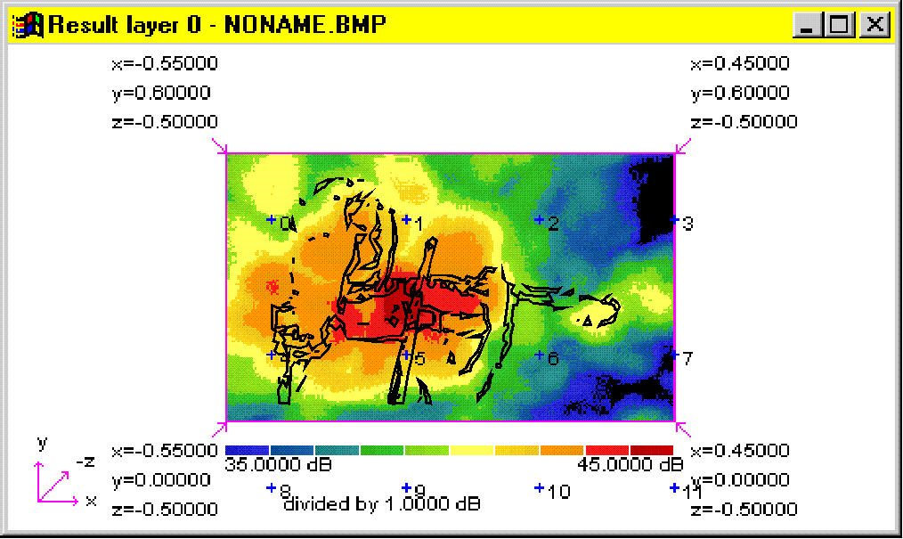 Relative to channel sound pressure (52.9 dB) the effective value of the interference images (see behind above image) lays between 34.6 and 44.8 dB. It means, that each place in the interference image is at maximum -10 dB or factor 1/3 so loud as the channels effective value is.