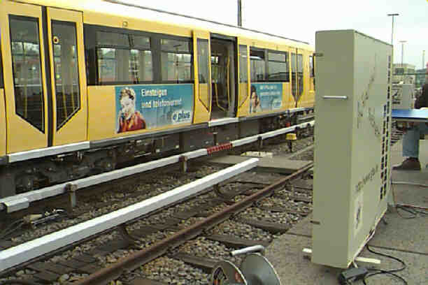 Zug auf dem Messgleis. Zugreihung: 1-2-3-4-5-6 von links nach rechts. BVG-Britz, 28.4.98