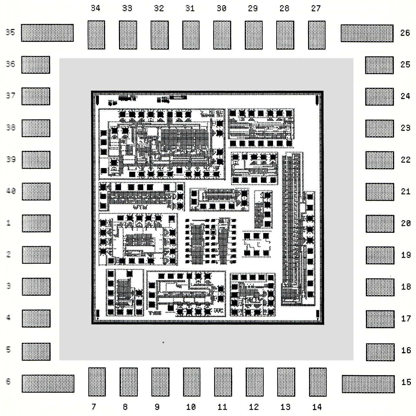 Bild 5: Beispiel eines Multi-Project Chips (MPC Wire Bonding Map) [14], ergänzt nach Fig.5.3.1, S.43. Die vereinzelten MPC-Chips wurden hier in ein 40-poliges Keramik-Standardgehäuse mit Silber-Epoxydharz eingeklebt. Mit einem Ultraschall-Bonder konnte dann der Teilnehmer seinen Entwurf manuell anschließen.