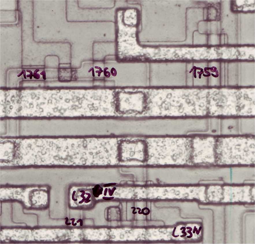 Ab und an ist der vermutliche Verlauf von Polyleitungen (polykristallines Silizium) unter dem Alu blau nachgezeichnet. Um Platz zu sparen, wurden die Transistoren (Logikgatter) in genialer Weise manuell unter die Leitbahnen "gequetscht". Man sprach von "Gummizellen-Design". Das Zeichnen des Layouts eines einzigen Gatters brauchte extrem viel Zeit und Manpower. Und jedes Gatter - auch wenn es vom selben Typ wie der Vorgänger war - war neu zu zeichnen und neu zu prüfen.