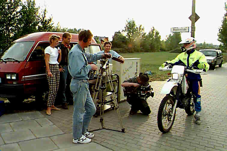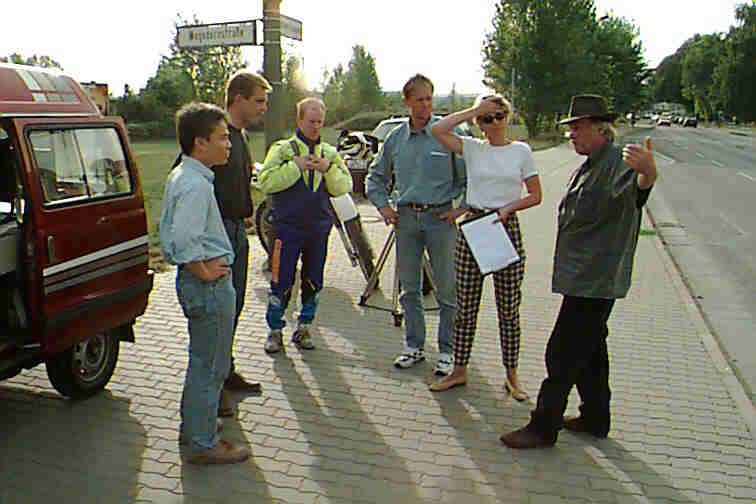 ![]() | Dr. Ing. Gerd Karl Heinz, GFaI Berlin: Ja, wir haben ursprünglich eigentlich Hirnaktivitäten erforscht (und stießen dabei auf 'Bilder des Denkens'). Ein Meßsystem, bestehend aus Soft- und Hardware wurde entwickelt. Schließlich gingen die Fördermittel aus (niemand verstand diese Sachen). Wir konnten auf dieser Strecke nicht weiterarbeiten. So nahmen wir die Elektroden vom Meßsystem ab, und klemmten Mikrofone an, um uns in der Akustik auszuprobieren. (Die Dimensionen des akustischen Laufzeitraumes sind denen des nervlichen ähnlich). Was dabei herauskam, ist die akustische Kamera. Wir sind damit in der Lage, Lärmquellen über dutzende von Metern aufzunehmen und quasi fotographisch aufzuzeichnen. Die akustische Kamera wird schußbereit gemacht. Ein letztes Kabel verbindet den Aufnahmeteil mit dem Rechner für die Datenauswertung. Für undsere Aufnahmen sind die Berliner Lärmfahnder einer ganz besonderen Spezies von Krachmachern auf der Spur: Motorrädern.