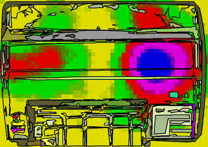 ![]() | Eine ähnliche Überraschung erlebten die Lärmforscher bei ihren Beobachtungen an Flugzeugen. Den höllischen Startlärm verursachen nicht allein die Turbinen, die gleiche Lärmintensität entsteht noch einmal durch Reflexion. Die zwei lilablauen Flecke zeigen: Lärm spiegelt sich am Asphalt. Schallschluckende Beläge könnten viel davon absorbieren.