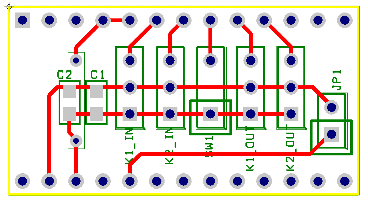 Auf der Rückseite des Boards ist eine Lochrasterplatte (Fig.3) aufgelötet, die den Anschluß der vier externen Kabel (K1_In bis K2_Out), eines Ein-Aus-Schalters für die Signalverzögerung und einer Spannungseinstellung mit JP1 gestattet.