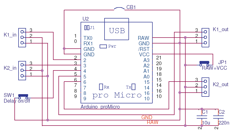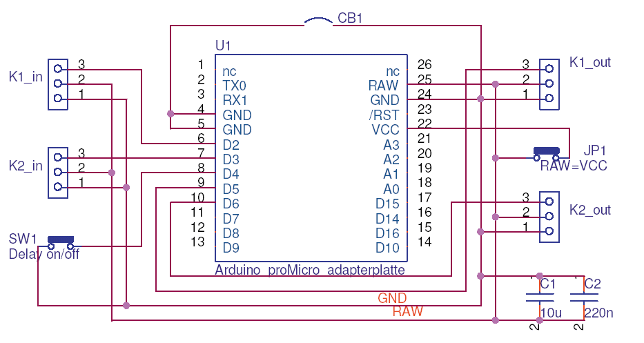 Das Verzögerungsmodul wird mit einem Board "Arduino proMicro" von Sparkfun mit 16 MHz und 5 Volt (auf der Basis Atmel ATmega32U4) realisiert. Eine Innenschaltung des Arduino-Moduls findet sich unter folgendem Link bei Sparkfun.
