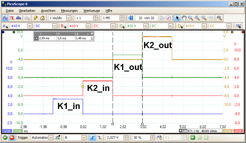 Fig.6: Oszillogramm des Verzögerungsmoduls mit Eingabe und Ausgabekanälen. K1_out und K2_out erscheinen gegenüber K1_in und K2_in um 2,5 Sekunden verzögert.