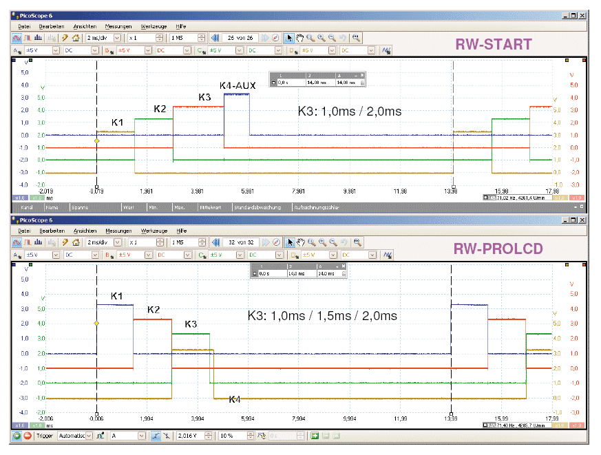 Fig.1: Timing-Diagramme von "Reflex Wheel Start" und "Reflex Wheel PRO LCD". Beide Anlagen arbeiten mit einem Frame von 14 Millisekunden.