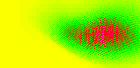 Fig.5: First acoustic photo with noise reflected at clouds over the Berlin city. At inversion wheater conditions, the ground is colder than the clouds, the warmer clouds diffract the noise back to the ground, so one can hear over very large distances. The recording distance was more then approx. 10 kilometers with the microphone array hanging at Building 13.7, 8th floor. See the array in Fig.1a), and the view direction in Fig.1b). Colors: Yellow for strong activity; blue for week activity (inverse colour table). The bigest yellow dot pointed accidental in direction to the Alexanderplatz.