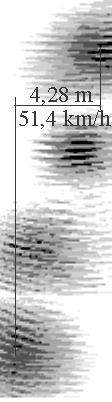 Fig.2c) shows a Ford Fiesta crossing from left to right the Kekulestr. in a distance of 70 meter. Interference integrals done with 1000 samples each/10kHz. The reflexions behind the car ar very intensive. Thus the excitement appears on a higher position, when passing the house right in the foreground. Picture dimension: 50x10 meters, multiplication of masks, focus 70 meter. Data: 0808_21.chl, Abtastrate 10 kHz, Hardware-Filter 0.5dB: HP: 300Hz/300Hz, TP: 1000/1000Hz. Click the image to hear it.
