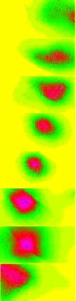 Fig.4: The movie shows the car at the Rudower Chaussee, crossing from right to left under strong wind influence. The excitement locations move around. Click the image, to get the historic original AVI-file. Subsequent short-time integrals (25ms) of the car in 170 meter distance under influence of wind