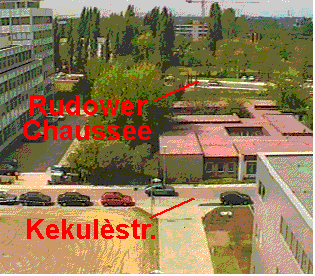Fig.3: The movie shows a bus, crossing the Rudower Chaussee from right to left in a distance of 170 meter. Click the image, to get the historic original AVI-file.